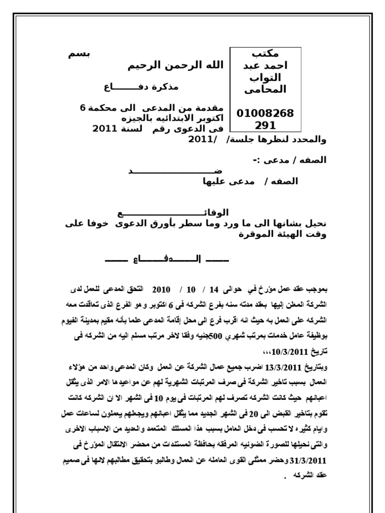 صيغة و نموذج لائحة شكوى عمالية في عقد عمل محدود المدة استشارات قانونية مجانية