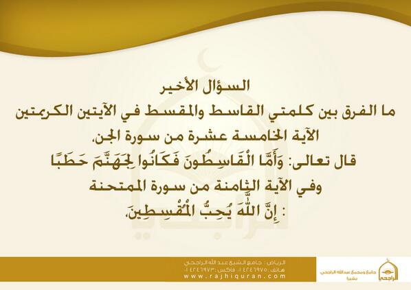 جامع عبدالله الراجحي On Twitter السؤال ما الفرق بين كلمتي القاسط والمقسط في الآيتين الكريمتين الآية 15 من سورة الجن وفي الآية 8 من سورة الممتحنة Http T Co Mbjtzjnzgg