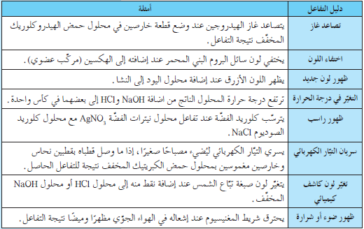 عدد ثلاثة من المؤشرات التي تدل على حدوث التفاعل الكيميائي المتصدر الاول